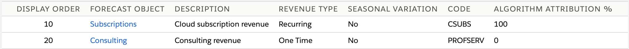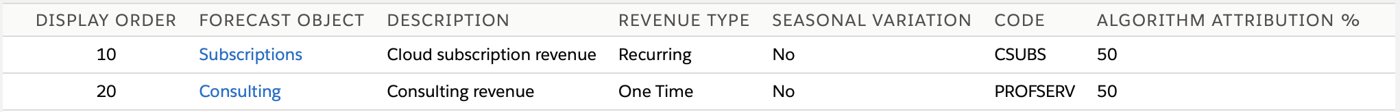 A forecast object represent a revenue type that can be forecasted for opportunities and orders. Each forecast object added to a forecast results in a separate line of values for each opportunity/order.