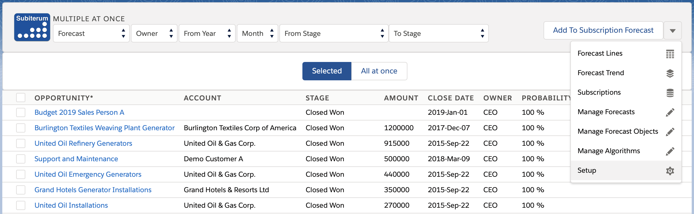The underlying data is the same as for Forecast Line page which means a user only sees values for opportunities, orders and subscriptions that are accessible.